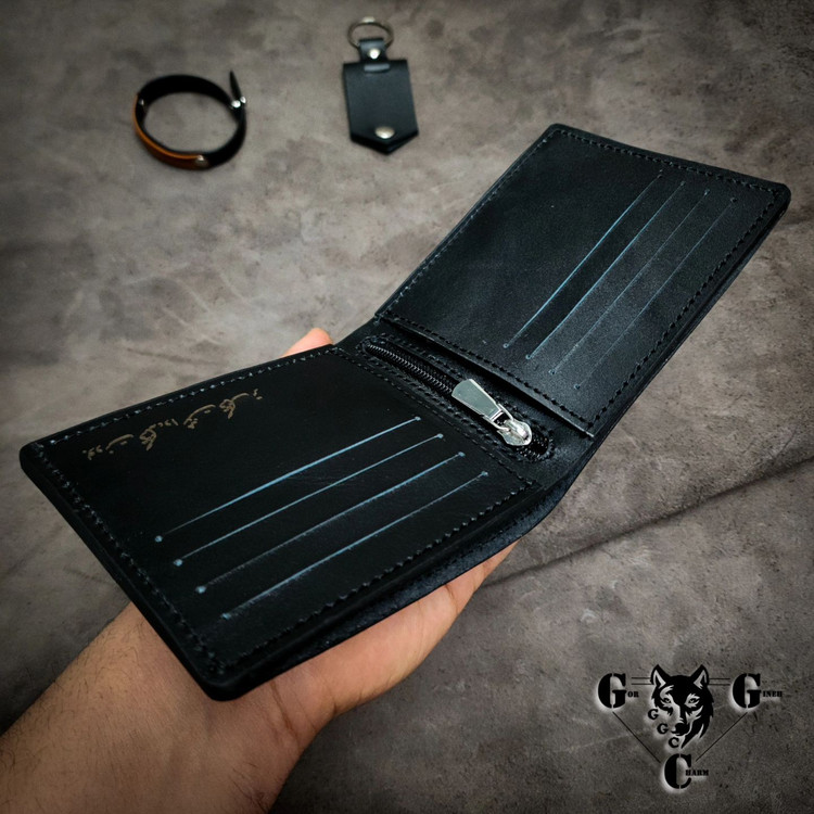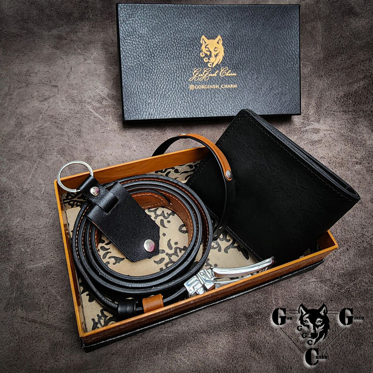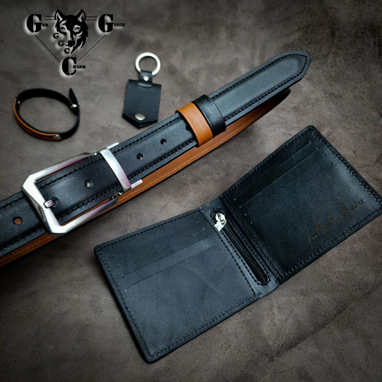 این ست بسیار شیک شامل کیف پول، کمربند، جاکلیدی و دستبند تمام چرم از جنس چرم ناپای گاوی درجه۱ به رنگ مشکی و عسلی است. کیف پول دارای ۸ جای کارت، دو محفظه بزرگ برای قرارگیری انواع مدارک یا کارت، یک محفظه زیپ دار و یک جای پول می باشد. کمربند از سه لایه چرم طبیعی ساخته شده و یراق مصرفی در کمربند سگک چرخشی ترک می باشد. جاکلیدی یک دکمه چهارپارچه دارد و داخل آن میتوانید عکس، نوشته، دعا و ... بچسبانید. این ست در هاردباکس مخصوص مجموعه با لوگوی طلاکوب شده ارائه می گردد. تمامی محصولات مجموعه گرگینه چرم قابلیت شخصی سازی دارند و شما می توانید از طریق "تماس با ما" تمامی جزئیات محصول اعم از رنگ چرم، سایز، مدل، دوخت روی کار و ... را تغییر دهید. همچنین محصولات ما دارای ضمانت سلامت و کیفیت می باشند و درصورت داشتن کوچکترین ایرادی مرجوعی شما "بالبخند" پس گرفته میشود.