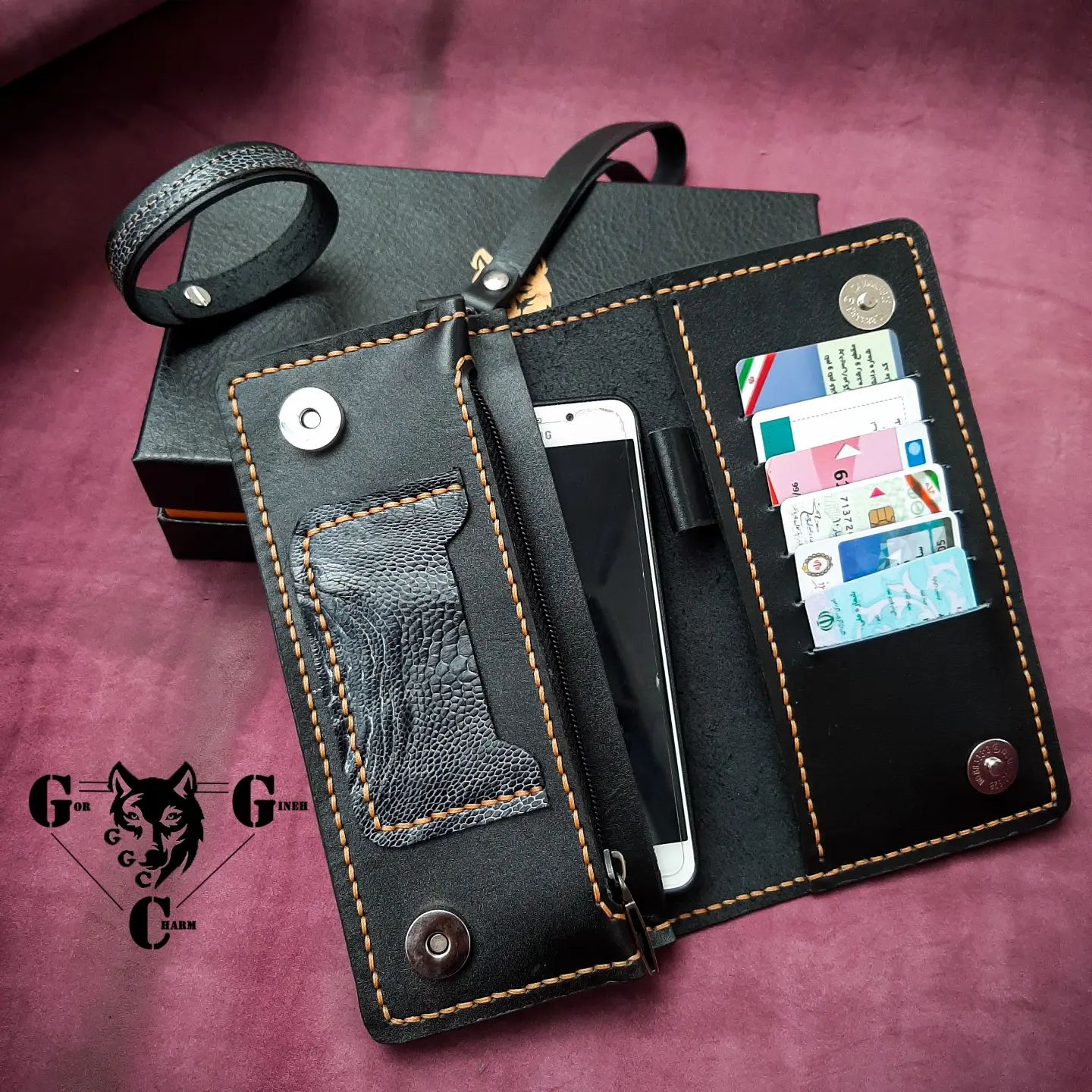 این ست لوکس شامل کیف مدارک، و دستبند کاملا دست دوز از جنس چرم ناپا گاوی و ساق شترمرغ به رنگ مشکی مات می باشد و در هاردباکس اختصاصی برند گرگینه چرم تقدیم می گردد. دارای پرداخت لبه ی حرفه ای است. این کیف مناسب برای مدارک شما از جمله مدارک ماشین، شناسنامه، پاسپورت، ۷ جای کارت اعتباری، گوشی و یک جیب زیب دار نیز واسه اشیای ریز از جمله: فلش، سیمکارت و تعبیه شده. این ست در هاردباکس اختصاصی مجموعه با لوگوی طلاکوب شده گرگینه چرم ارائه میگردد. تمامی محصولات مجموعه گرگینه چرم قابلیت شخصی سازی دارند و شما می توانید از طریق "تماس با ما" تمامی جزئیات محصول اعم از رنگ چرم، سایز، مدل، دوخت روی کار و ... را تغییر دهید. همچنین محصولات ما دارای ضمانت سلامت و کیفیت می باشند و درصورت داشتن کوچکترین ایرادی مرجوعی شما "بالبخند" پس گرفته میشود.