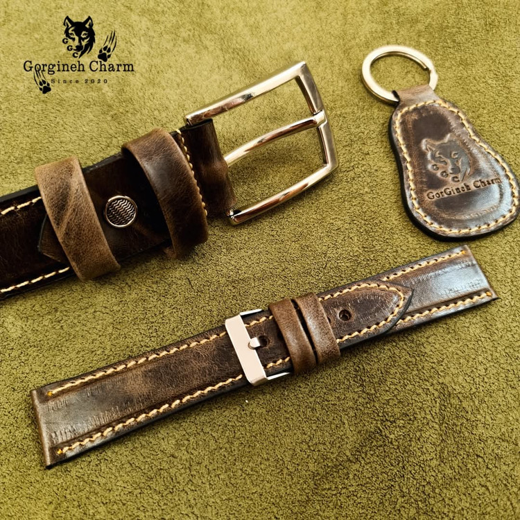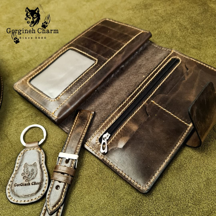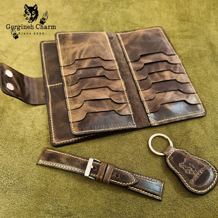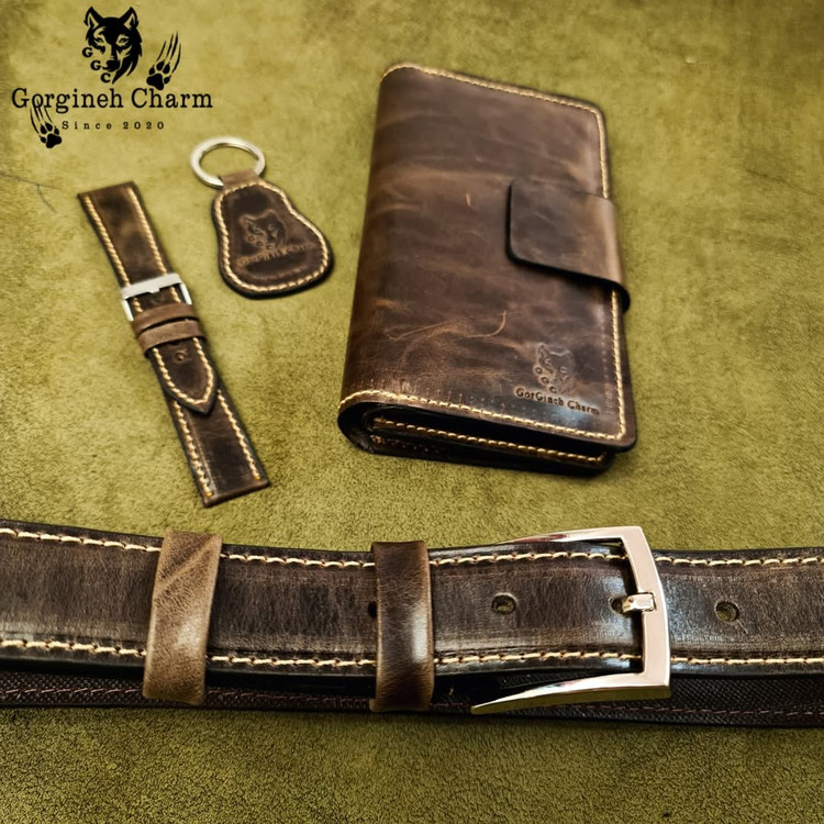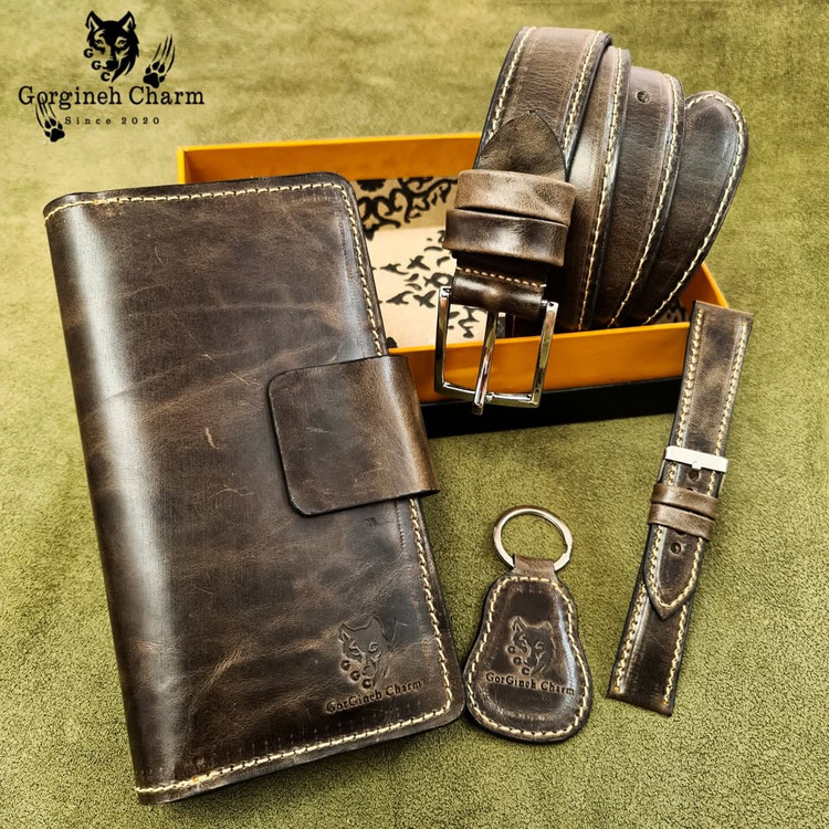 ست کامل شامل هاردباکس، بند ساعت، کیف مدارک، کمربند و جاکلیدی می باشد و از چرم لوکس افکتی ایتالیایی براق ساخته شده است.